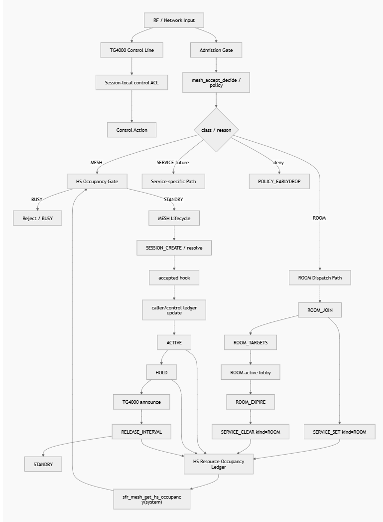 SFR-Mesh introduces a newly developed upper-layer TG control mechanism called LUTG. It redefines the role of conventional Talk Groups from simple distribution destinations into session-creation triggers. By doing so, TG control—traditionally centralized—is distributed to individual SFR (Single Frequency Repeater) nodes, enabling the dynamic formation of mesh-connected communication sessions.