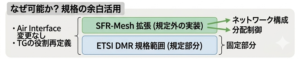 この意味で SFR-Mesh は、「Tier II の外形を保ったまま、Tier III 的な思想を内部に実装したもの」 であり、説明上これを DMR Tier 2.5 と位置付けるとイメージしやすいと思います。